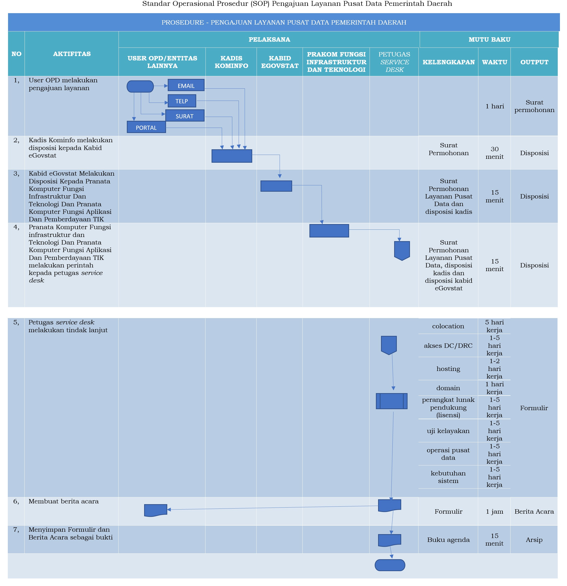 1.  Pemohon layanan melakukan pengajuan layanan melalui service desk dengan mengisi formulir layanan yang diajukan pada portal / e-mail / mobile / chat / datang langsung di hari kerja pukul 08.00 wib s.d. 16.00 wib